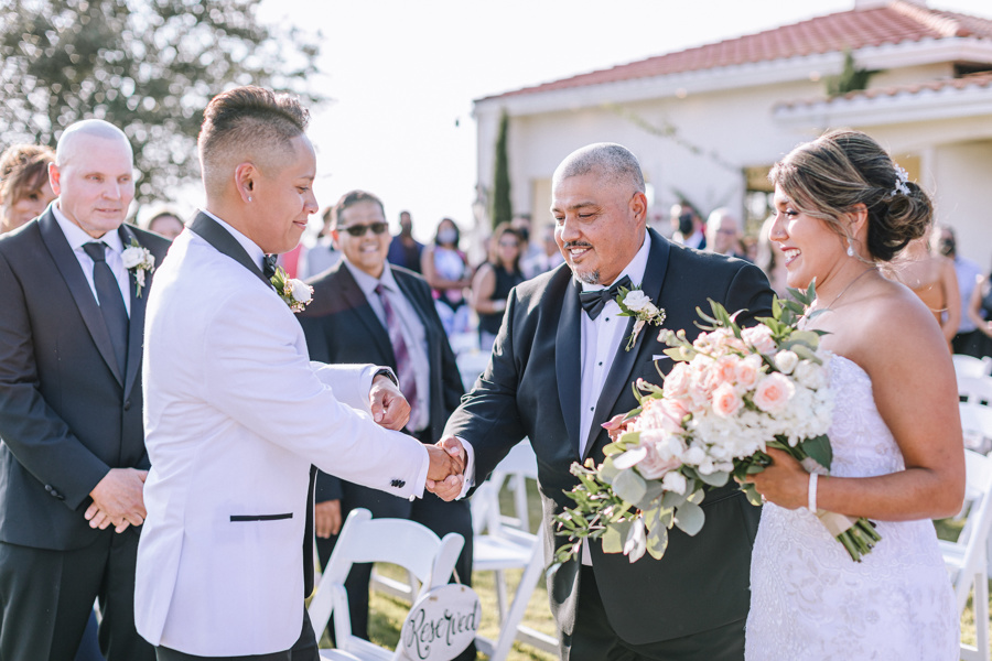 The couple wanted their ceremony to be as unique and meaningful as their relationship. They decided to incorperate the lasso ritual to honor their Catholic roots. Reverend Kathy Gonzalez called upon the couple’s representatives to place a rosary around the two in a figure eight formation, creating an inifinty symbol. This shape is symbolic of the pairs everlasting commitment and undying love to one another.